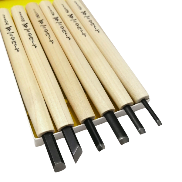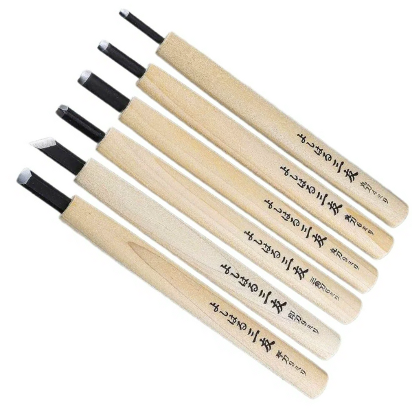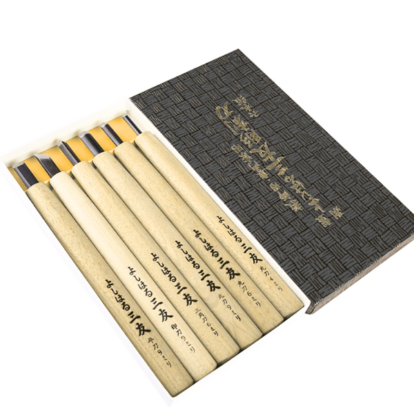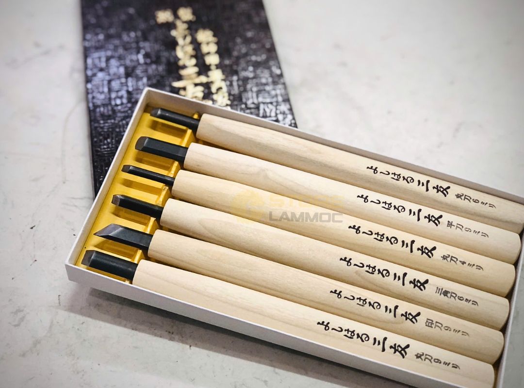 Bộ dao điêu khắc gỗ Yoshiharu gồm 6 chiếc dao đa dạng kiểu dáng, phục vụ tối ưu cho nhiều kỹ thuật chạm trổ gỗ khác nhau. Mỗi con dao có thiết kế riêng biệt phù hợp với từng mục đích sử dụng như đục phẳng rộng, đục vát hay đục nửa tròn.