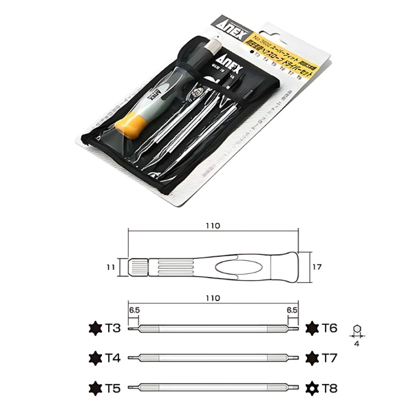 Bộ tua vít điện tử Anex No.3602 hoa thị size nhỏ cung cấp cho bạn một giải pháp đáng tin cậy và thuận tiện để sửa chữa các thiết bị điện tử nhỏ gọn. Với thiết kế nhỏ gọn và đa dạng các mũi vít, sản phẩm này đáp ứng mọi nhu cầu của bạn.
