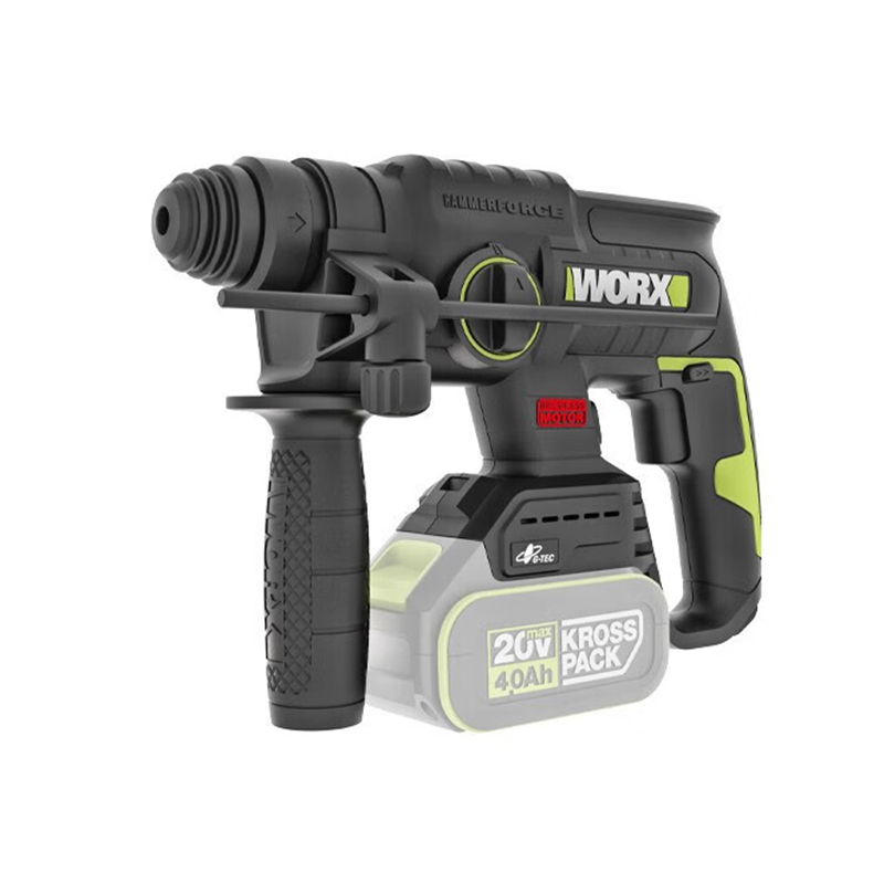 - Máy khoan Worx WU387 hoạt động với điện áp 20V cùng lực búa 2.0J, giúp khoan đục hiệu quả trên nhiều vật liệu cứng như bê tông, thép và gỗ. Tốc độ không tải tối đa 1350 vòng/phút và nhịp búa lên đến 4700 lần/phút hỗ trợ làm việc nhanh chóng, chính xác.