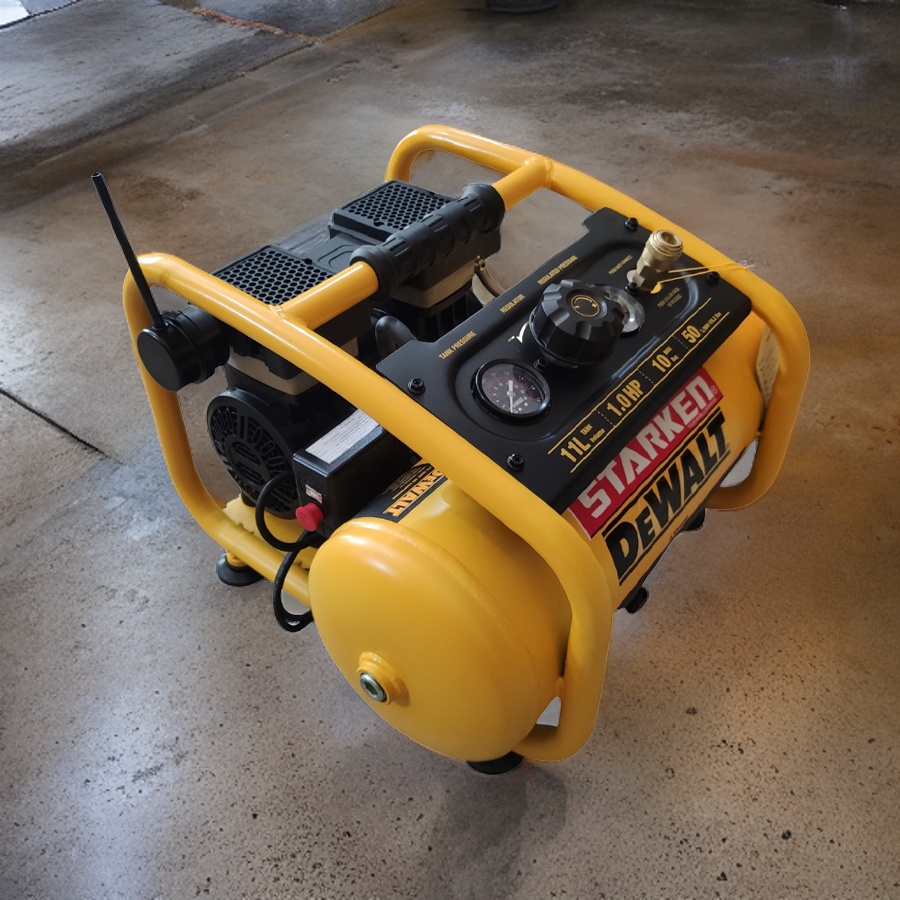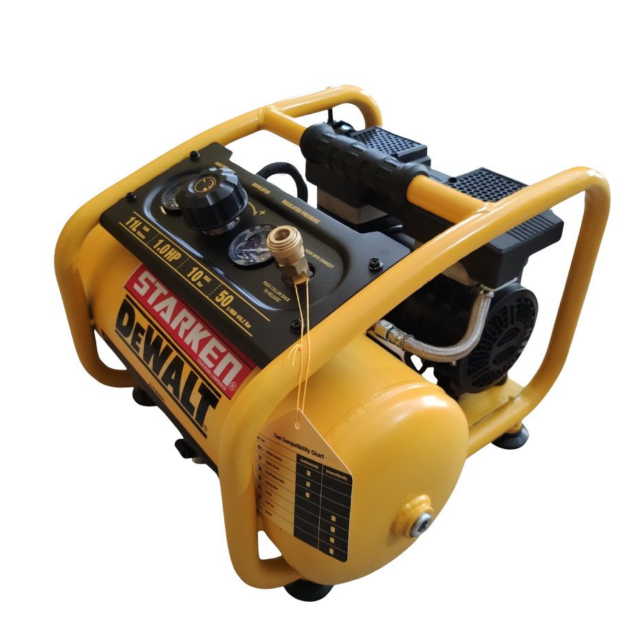 Máy nén khí không dầu DEWALT DXCM3301181 có dung tích bình chứa 11L, kích thước 20x16x19 inches và chỉ nặng khoảng 50lbs. Sản phẩm này được thiết kế nhỏ gọn và dễ di chuyển, phù hợp cho các công việc sửa chữa và xây dựng. Máy nén có bộ điều khiển áp suất tự động, không yêu cầu bảo trì do không có dầu bôi trơn.