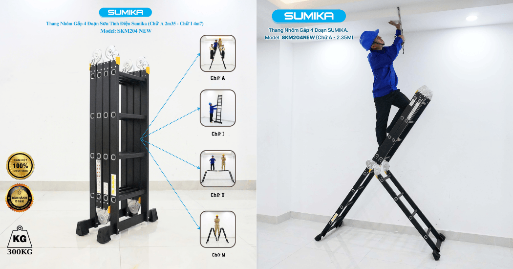 Thang nhôm gấp đa năng 4 đoạn SUMIKA SKM204 New dài 4.58m là sản phẩm được làm từ nhôm hợp kim cao cấp, có khả năng chịu lực cao và rất bền. Với thiết kế thông minh 4x4 bậc, chiều cao mở dạng chữ I lên tới 4,58m và trọng lượng khoảng 15.3kg, sản phẩm này giúp bạn dễ dàng tiếp cận các khu vực khó khăn và di chuyển một cách thuận tiện. Sản phẩm có tải trọng lên tới 150kg và được bảo hành 12 tháng.