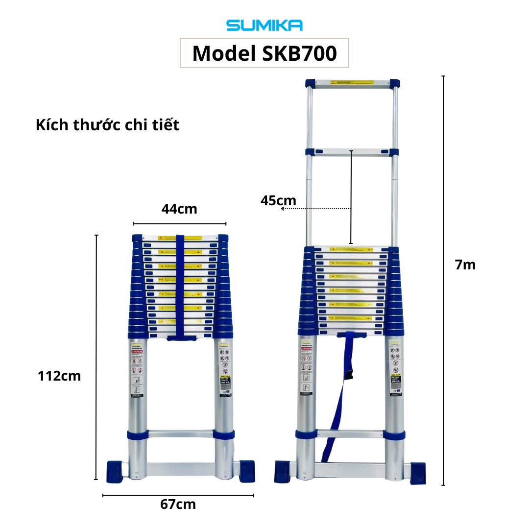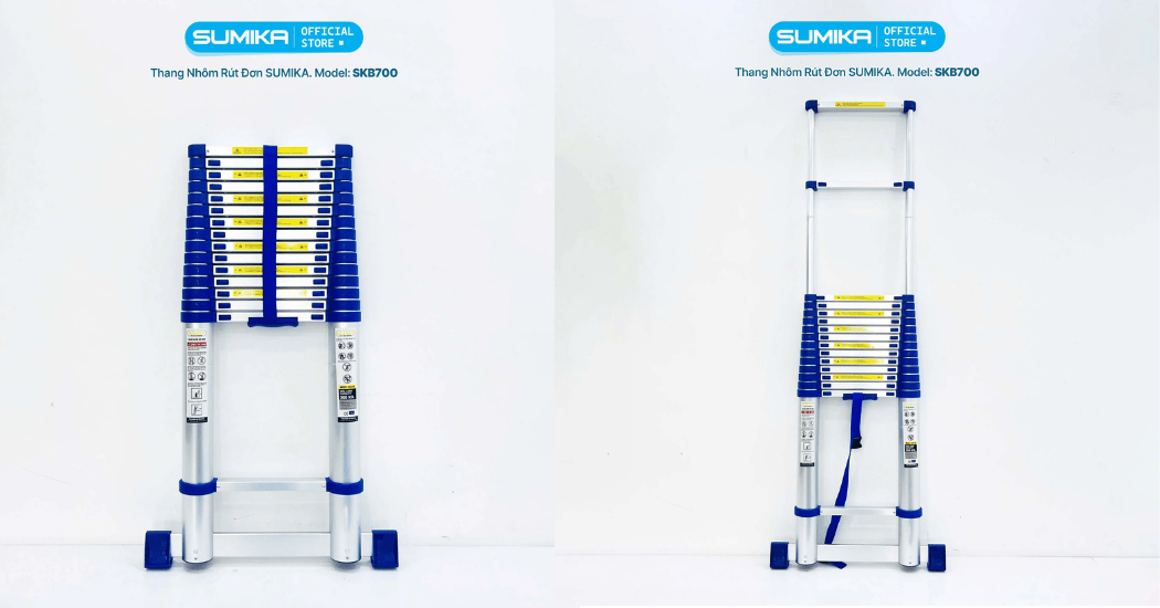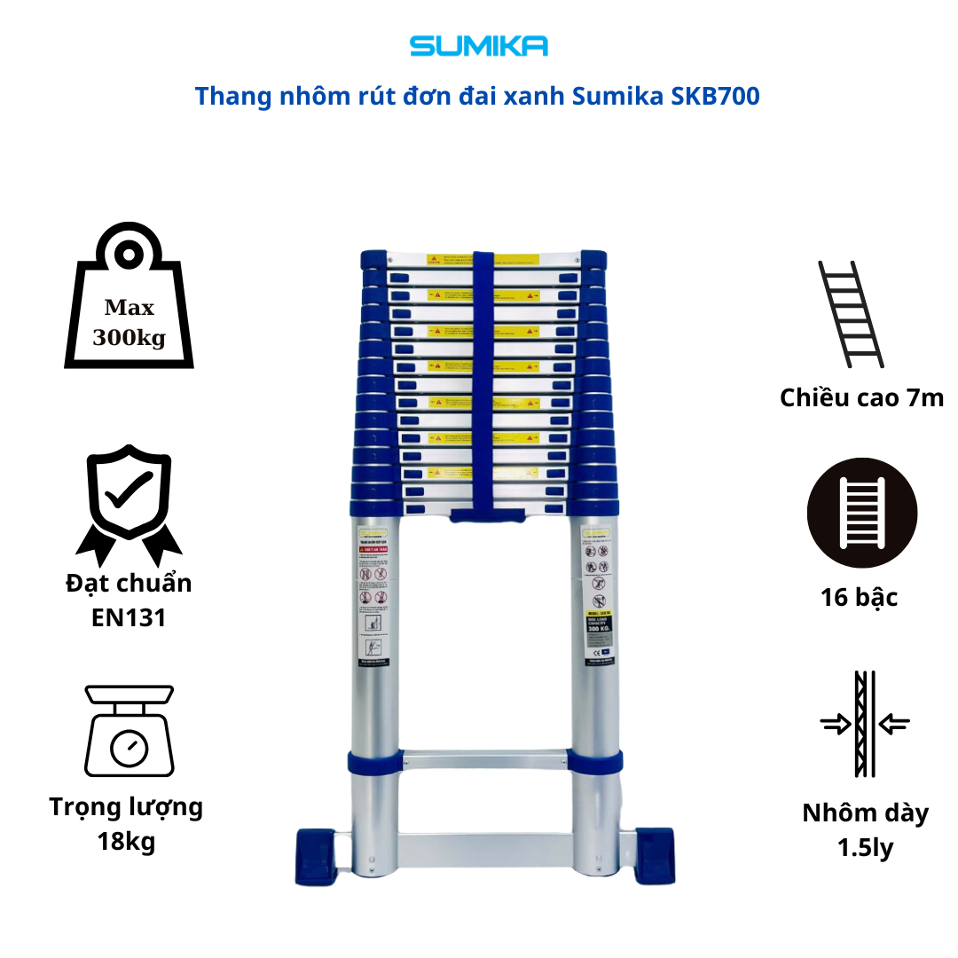Thang nhôm rút đơn 7m đai xanh SUMIKA SKB700 là sự lựa chọn cực kỳ hoàn hảo cho mọi nhu cầu làm việc trên cao nhờ độ an toàn, linh hoạt và tiện dụng. Đầu tư sản phẩm này giúp bạn yên tâm chinh phục mọi thử thách ở tầm cao!