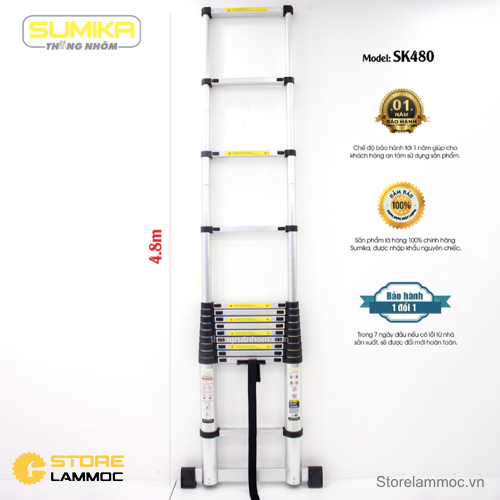 Thang nhôm rút SUMIKA SK480 dài 4.8m là sản phẩm an toàn, tiện lợi và bền bỉ, đáp ứng được nhu cầu của các công ty xây dựng, cơ khí hoặc cá nhân trong công việc hàng ngày. Chất liệu nhôm cao cấp giúp sản phẩm không bị gỉ sét và có thể sử dụng lâu dài.