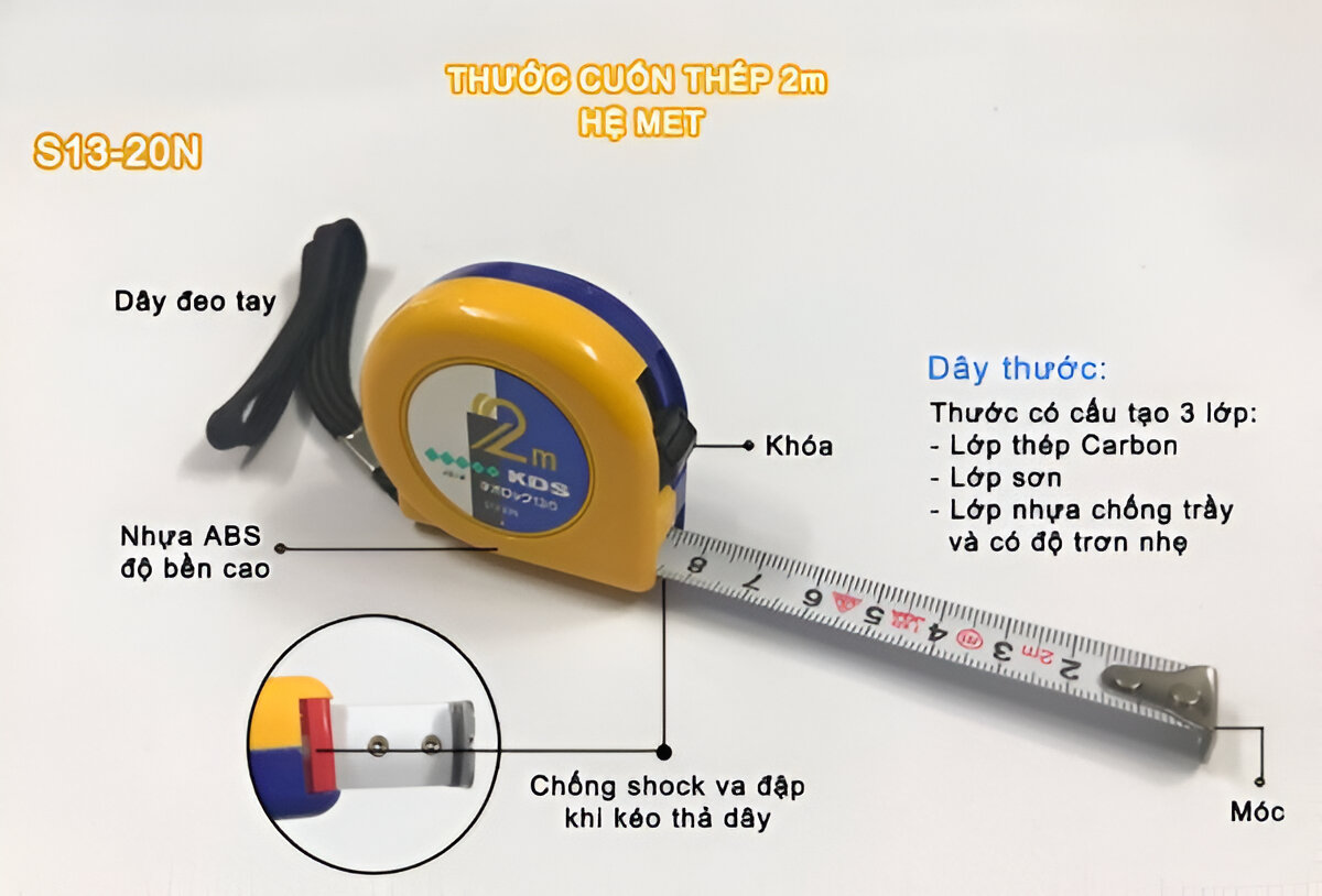 Thước kéo (cuộn) Nhật 2m KDS S13-20N là sản phẩm thước kéo nhỏ gọn và tiện lợi. Với thiết kế phù hợp với tay VN, sản phẩm mang lại sự thoải mái và dễ dàng khi sử dụng. Được tráng Acrylic chống trày, thước kéo giữ được độ rõ nét của thông số sau nhiều lần sử dụng. Với lớp JIS1, sản phẩm cung cấp sự ổn định và chính xác trong quá trình đo lường. Cùng với hỗ trợ giảm chấn khi kéo thả thước, bạn có thể đo lường một cách dễ dàng và chính xác hơn bao giờ hết.