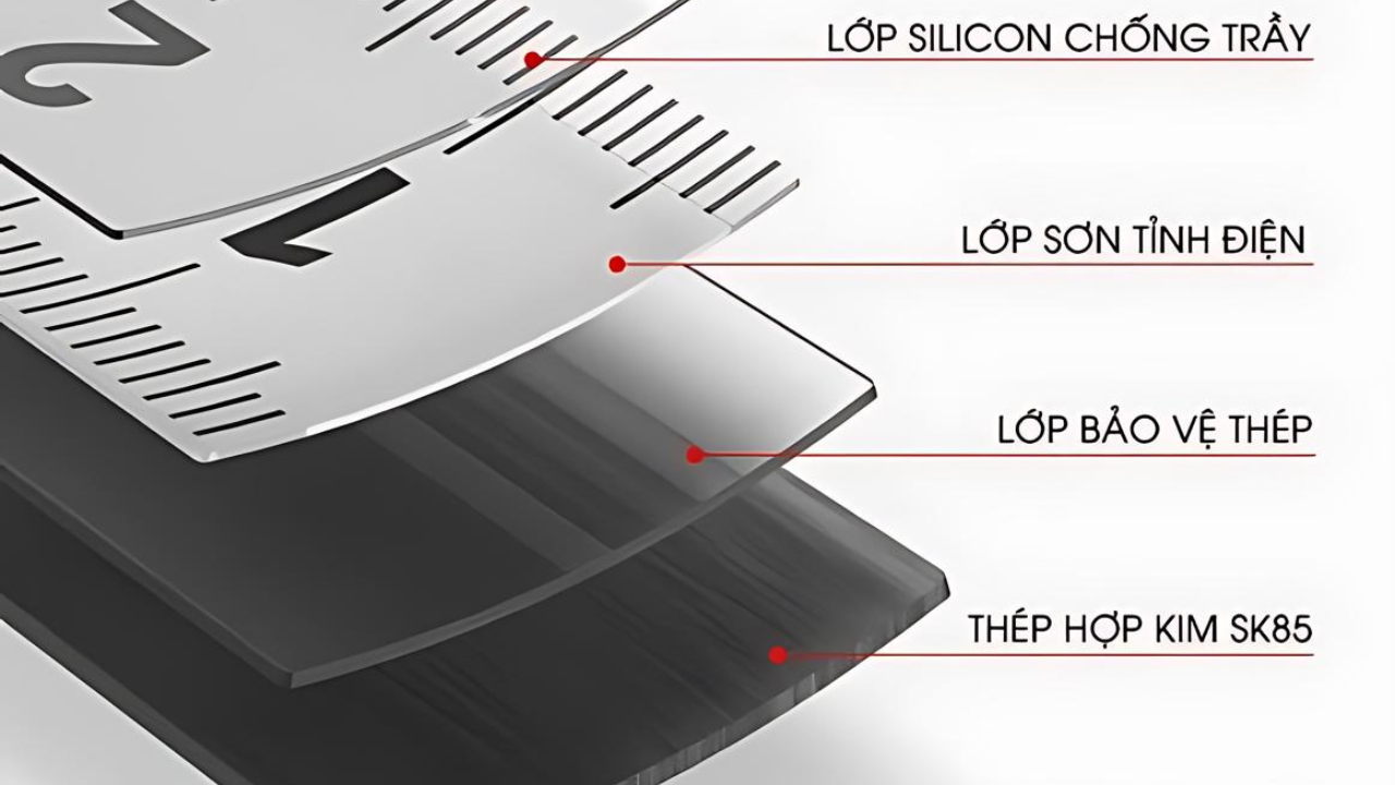 - Lưỡi thước thép: Lưỡi thước được làm bằng thép carbon phủ nylon, chống gỉ sét và mài mòn, đảm bảo độ chính xác cao trong quá trình đo lường.